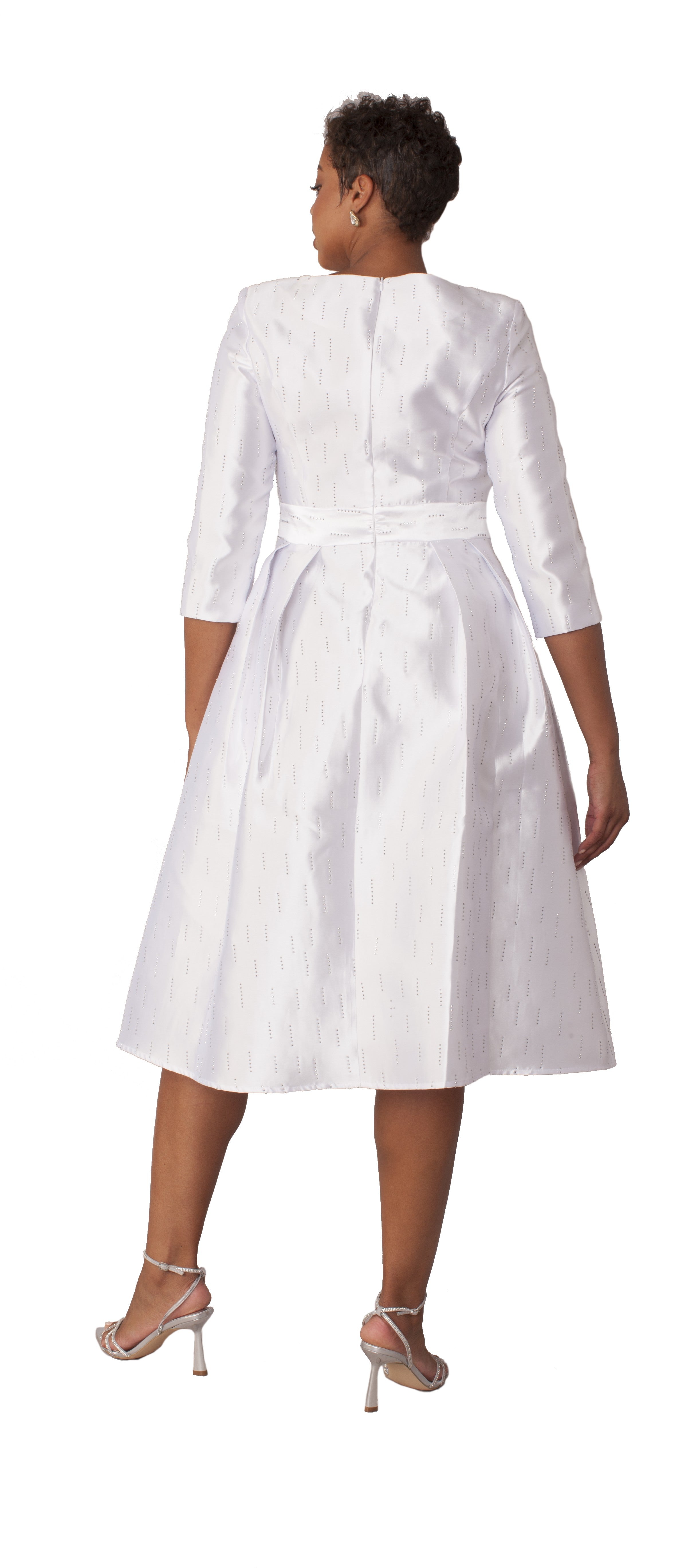 Timeless elegance meets modern sophistication in this white tea-length dress. Features a fitted bodice with 3/4 sleeves, a defined waistband, and a full pleated skirt. The subtle shimmer fabric creates a delicate sparkle effect throughout, perfect for religious ceremonies and formal occasions. Ideal for baptisms, temple ceremonies, church events, or any special occasion requiring refined white attire.